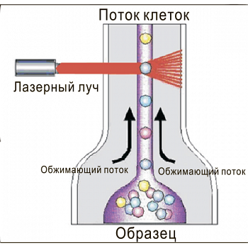- Гидродинамическое фокусирование струи клеточной суспензии в струе дисперсионной среды приводит к тому, что исследуемые клетки или их ядра выстраиваются поодиночке и в таком порядке пересекают пучок сфокусированных лазерных лучей.